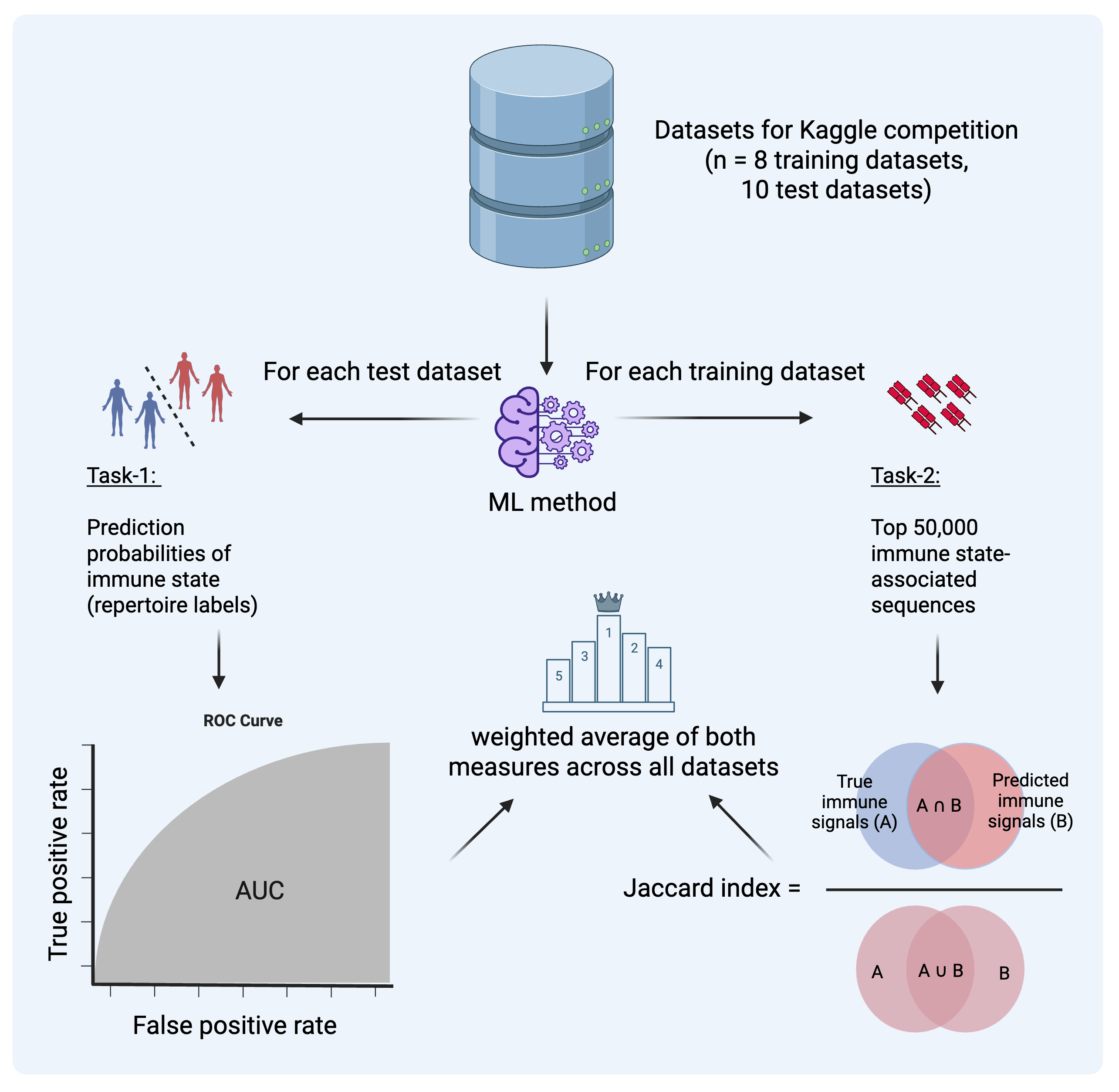 In this competition, you’ll develop machine learning models to simultaneously perform two tasks: (a) predict the immune state (e.g. disease, healthy) of individuals based on so-called adaptive immune repertoires (sets of protein sequences), and (b) identify immune state-associated receptor sequences (those that explain immune state in the first task). The goal is to expedite ML-based solutions for immunodiagnostics and therapeutics discovery.